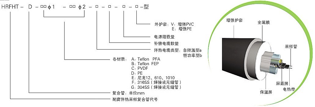 耐腐采樣伴熱復(fù)合管是環(huán)保監(jiān)測(cè)系統(tǒng)中的重要部件,它是由一組耐腐高性能樹(shù)脂導(dǎo)管輔以自限溫伴熱帶以及補(bǔ)償線纜組成內(nèi)芯,外加保溫層,最后敷以阻燃聚乙烯(PE)保護(hù)外套復(fù)合而成。自限溫伴熱帶的自動(dòng)限溫功能,可以保證采樣管內(nèi)維持一定的溫度,從而盡可能保證采集樣品與初始值保持一致,最終確保環(huán)保監(jiān)測(cè)系統(tǒng)連續(xù)、正確地采集樣氣。根據(jù)采集樣氣的成份、溫度等實(shí)際情況,耐腐伴熱采樣復(fù)合管中采樣導(dǎo)管可以選用不同的材質(zhì),如PFA(四氟乙烯與全氟烷基醚共聚物)、FEP(四氟乙烯和六氟丙烯共聚物)、PVDF(聚偏二氟乙烯)、PE(阻燃聚乙烯)、尼龍610等等, 伴熱帶可以選用中、低、高溫度伴熱帶,另外還可以根據(jù)用戶要求添加補(bǔ)償導(dǎo)線、電源線等 。