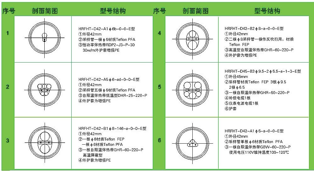 部分防腐采樣伴熱復(fù)合管型號(hào)、結(jié)構(gòu)、剖面簡(jiǎn)圖一覽表: