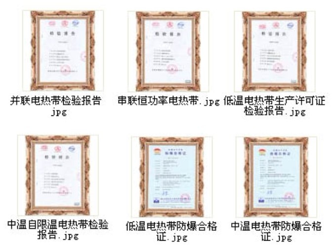 此外,我司針對石油、消防、電廠、天溝融雪、混凝土養護、汗蒸房等行業專用研發的電伴熱帶產品獲得了國家十三項專利證書.是全國電伴熱行業中產品資質最為全面的國家高新技術企業,專業的電伴熱生產廠家。以上證書詳細見我司官網資質中心。