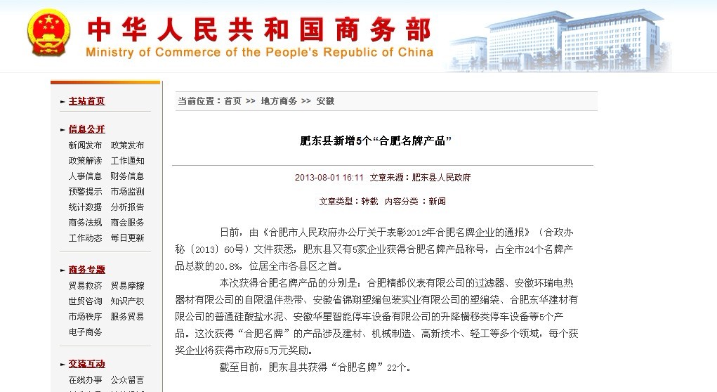 熱烈祝賀環(huán)瑞憑借自限溫電伴熱榮獲合肥名牌產(chǎn)品榮譽(yù)稱(chēng)號(hào),以下為中華人民共和國(guó)商務(wù)部轉(zhuǎn)載新聞,內(nèi)容如下: