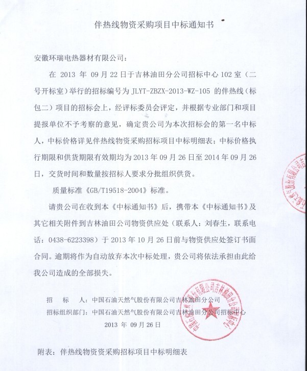 此次成功競標吉林油田,也是甲方在去年使用過我司的電伴熱帶后做的慎重選擇,是對于我司電熱帶產(chǎn)品質(zhì)量的主要肯定。 本次項目包括自限溫、恒功率電熱帶兩大系列。目前正在緊張的進行后續(xù)的項目合作中。以下為環(huán)瑞中標通知書