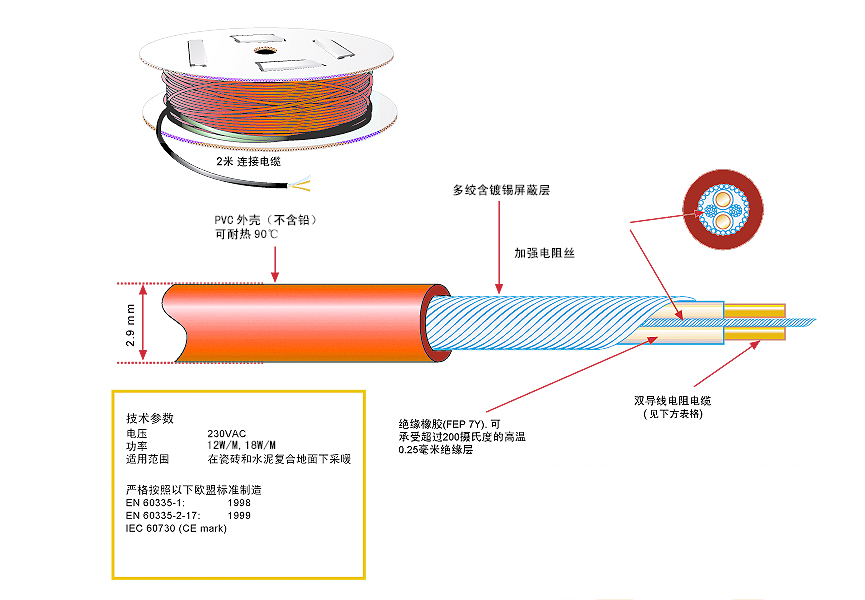 環(huán)瑞最新研發(fā)3.7毫米直徑的雙導電地熱線-新型發(fā)熱電纜,可滿足5毫米-100毫米不同覆蓋厚度設計。