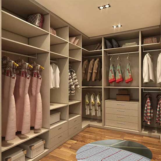發熱電纜地暖是將發熱體發熱電纜埋于地下,不影響衣帽間的整體美觀。它升溫迅速,通過地面傳導和輻射形式加熱房間內的密實物體和空氣,不存在空氣對流是采暖,避免了室內灰塵流動。開啟之后,可有效除潮,保證衣帽間的干爽、潔凈。
